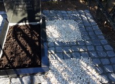 Практически все, что требуется для удовлетворительного внешнего вида – это обустроить пол. Так и в этом заказе. Мы сделали пол, частично из брусчатки, частично из мраморной крошки. Установили металлическую лавочку. Поправили покосившуюся плиту и установили цветник.