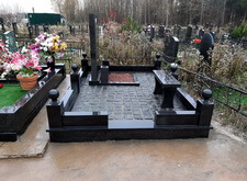 Завершающим этапом стала сборка оградки и укладка брусчатки. Ограждение мы создали из находившихся на могиле секций, кое где закрепив отломавшиеся навершия на разделительные столбики. Перед памятником мы установили гранитный цветник и две траурные урны, а по правую сторону от входа поставили заказанную клиентом лавочку, тоже изготовленную из чёрного гранита. Брусчатку мы замыли водой, одновременно удаляя всю строительную пыль, образовавшуюся в процессе работы.